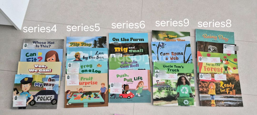 프랜시스파커 영유 5세 리딩교재 Early Leveled Readers입니다. 1년동안 시리즈1부터 9까지 배워요. 각 시리즈당 4권 구성입니다. 교재비로 한권당 만원씩 구매했었구요. (series7만 1권분실 Mr.Bear Where are you going?) 시리즈별로 구매하면 6,000원(택비별도,반택가능) 일괄구매시 택포 3만원 아이가 책마다 제일 마지막장 백지에 그림을 그려둬서 감안하여 저렴히 판매합니다. 그외 앞부분과 표지는 낙서 없이 깨끗합니다. 시리즈 7도 갖고 있긴한데 1권은 분실(Mr.Bear Where are you going?)에, 1권은 낙서되어있어서 원하시면 무료로 같이 드릴게요. leveled readers도 4분기부터 배우는데, level1 6권 따로 판매계획있으니 필요하심 말해주세요. 네임스티커 붙어져있으니 물티슈로 벅벅 문지르면 글씨지워져요. 아님 그 위에 바로 네임스티커 덧붙여도 됩니다. 환불불가