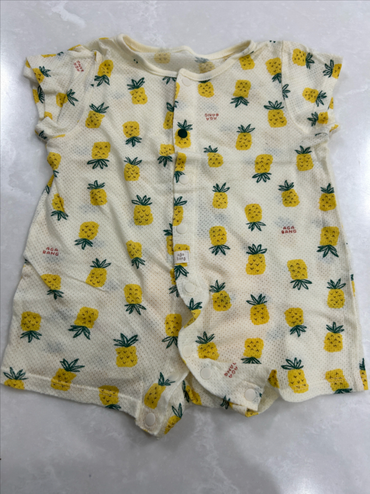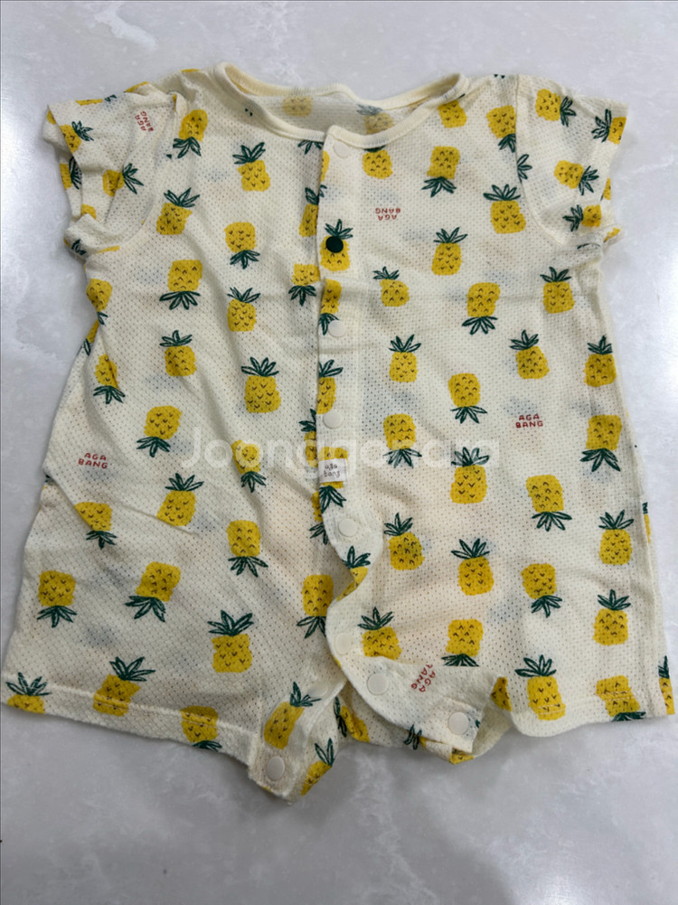 아가방 파인애플 아기 우주복 택을 잘라 확인이 어렵지만 70,75 정도 되는거 같습니다 가슴 단면 25 / 총장 33 ✔️사이즈 조언은 어렵습니다 ▪️반품•환불 불가_예민하신 분은 피해주세요