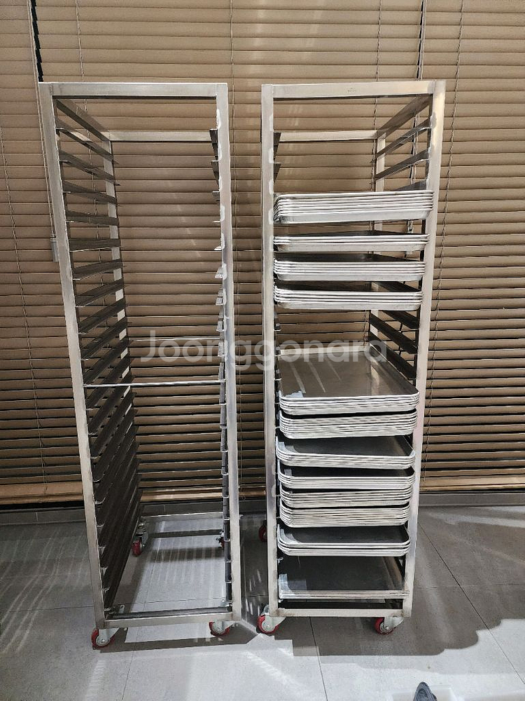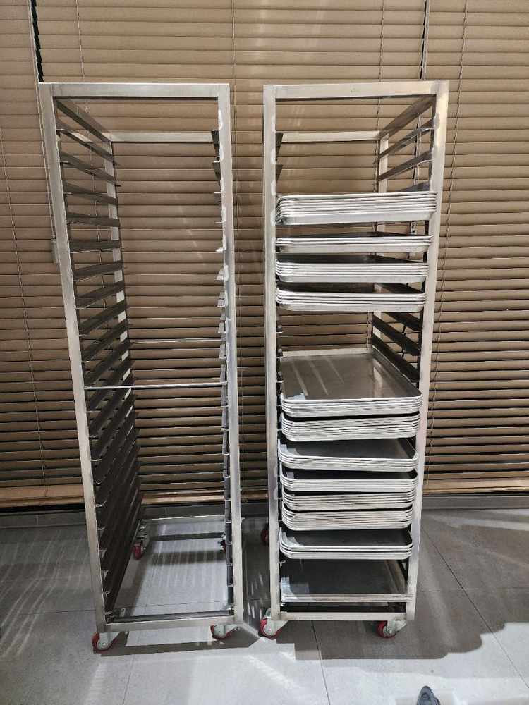 - 상품: 업소용 제과, 제빵용 렉(랙) 20매 - 사이즈: (외측기준) 470 × 600 × 1705(H) - 특이사항: 빵판(트레이) 40 Cm × 60 Cm 20매 수납용 2대입니다. 스테인레스 제질로 튼튼하며 일괄하시면 약간 네고 해드릴게요(대당 10만원). 상태는 최상이라 보시면 됩니다. 그외에 사용하든 트레이(3전원), 민판(3천원), 식힘망3,400원)... 그리고 스메그, 우녹스용 트레이(2,500원)및 타공팬(신품 6천원)도 다수 저렴하게 판매중이니 편하게 문의주세요~^^ 중고거래 특성상 구매 후 반품불가. 직접 가져가셔야 하며 타지역 배송시 착불배송. 판매지역은 울산 송정동 근교이며 빠른 판매를 위하여 저렴하게 판매하오니 많은 관심 부탁드려요 ~^^