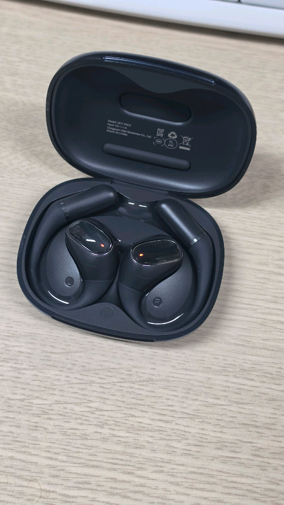 무선 이어폰이에요. 질 좋고 무선으로 사용하기 편리해요! QCY RACE 오픈형 무선 블루투스 이어폰 귀걸이형 귀찌 1회 사용 거의 새제품입니다