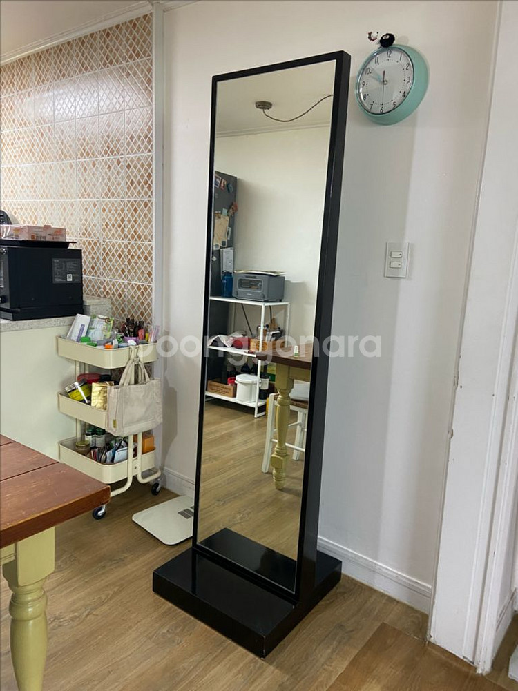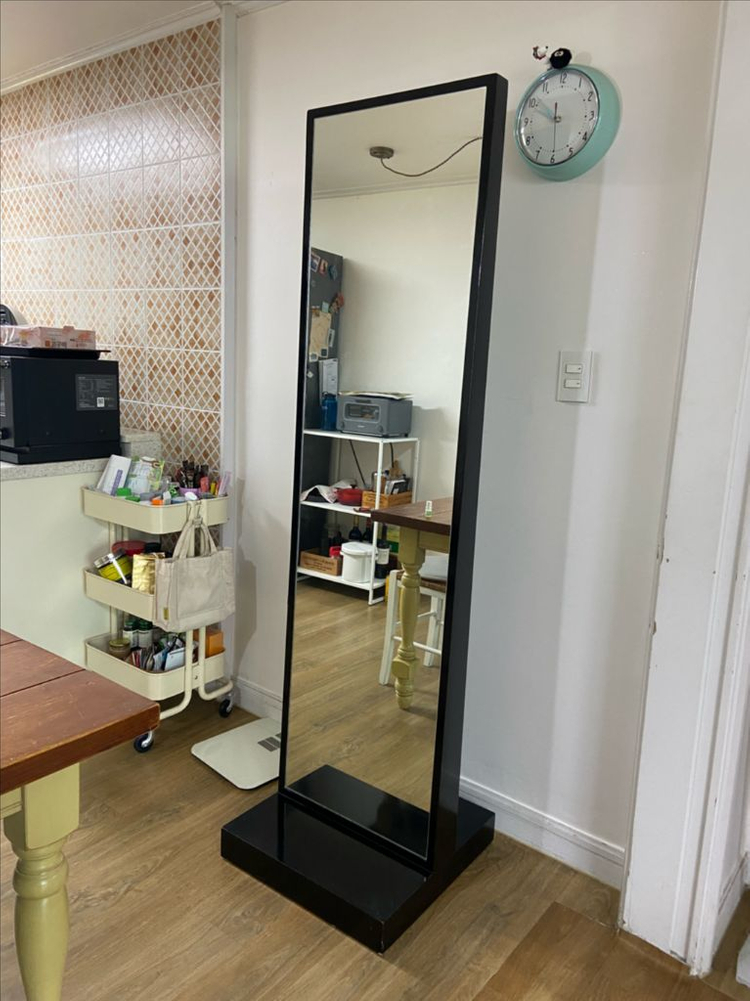 블랙 프레임의 전신 거울입니다 바닥에 바퀴가 달려있어 이동이 편리합니다 모서리 부분에 약간의 흠집이 있습니다(사진 참고) 높이1800x가로500 바닥500x500 직접 운반하셔야되요 지역은 충북 청주시 상당구 용암동입니다