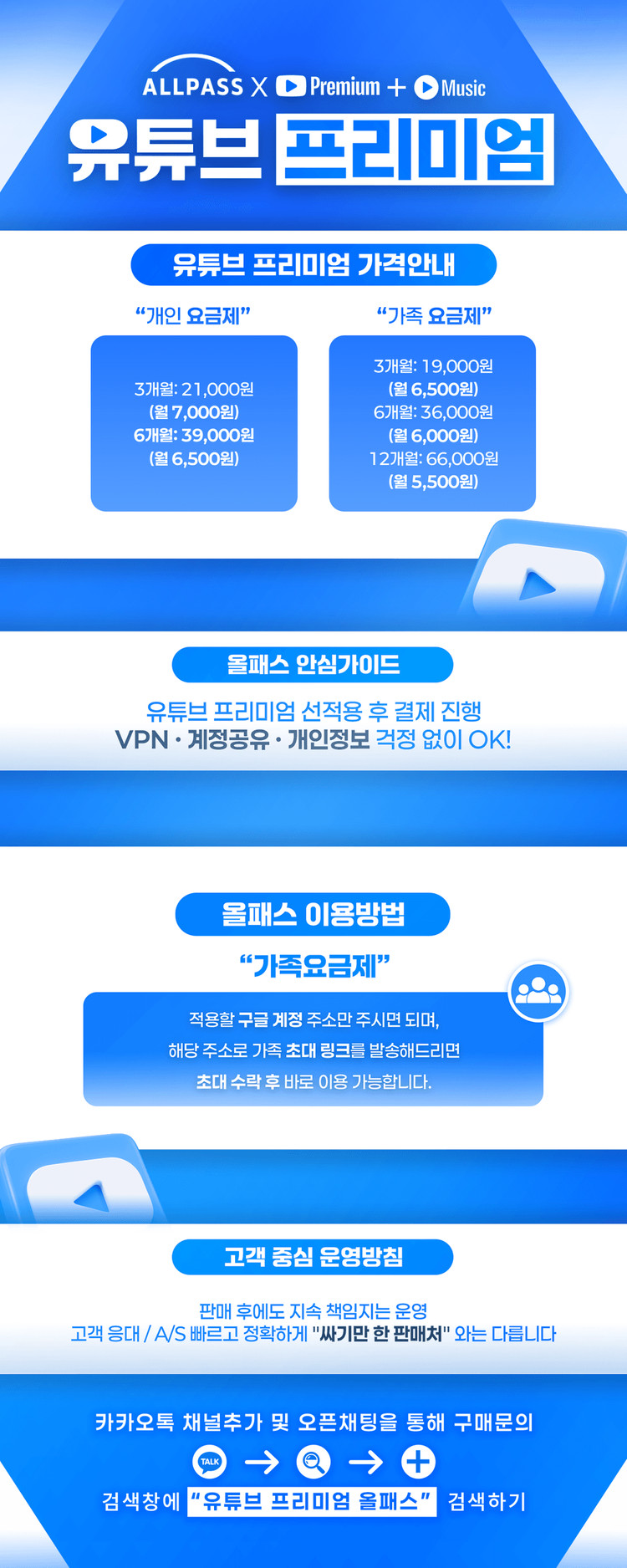 유튜브 프리미엄+뮤직 판매 후에도 계속 책임지는 운영! 고객 응대, A/S 빠르고 정확하게 “저렴하기만 한” 판매처와는 다릅니다 구매 문의는 게시된 이미지 '하단' 참고 부탁드립니다! 깨톡: 유튜브 프리미엄 올패스 <-- 검색하셔도 ㅋrㅋr오 채널 나옵니다.! 후기도 많으니 꼭 들려서 고민되시면 후기 보고 판단하세요! 가족요금제 3개월: 19,500원 6개월: 36,000원 12개월: 66,000원 개인요금제 3개월: 21,000원 6개월: 39,000원