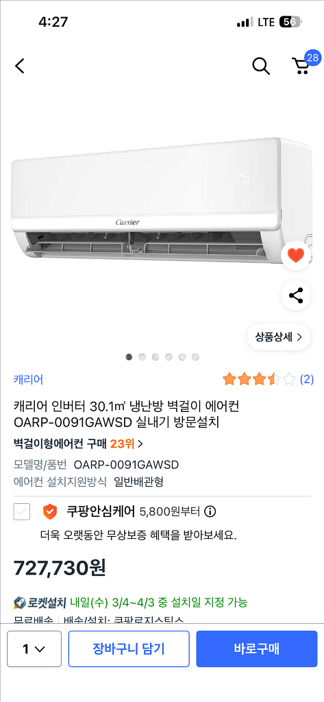 캐리어 벽걸이 에어컨입니다( 냉난방기 겸용) 온풍기능도 되는 제품. 모델명은 OARP-0091GAWSD입니다 - 냉방은 물론 난방, 제습까지 사계절 에어 솔루션 - 생활에 맞춘 최적의 온도 FOLLOW ME 모드 미개봉새제품입니다 배송지 이전해서 주소 상관없이 받을수 있습니다 방문설치비용 포함입니다 기본설치비는 무료이고 추가금이 드는 부분은 사진에 기재되있으니 참고해주세요 상품 구매링크입니다 https://link.coupang.com/a/dW6FjC