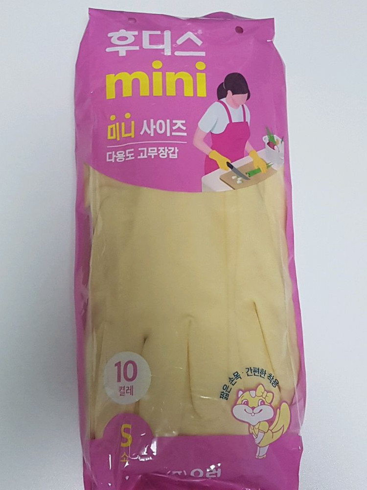 다회용 다용도 고무장갑 10켤레 한 묶음입니다. 사이즈는 S입니다. 손목이 짧게 나온 제품이라서 착용이 간편합니다.