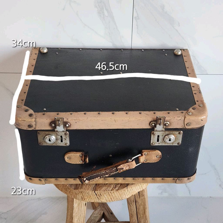 시간의 흔적이 고스란히 남아있는 클래식한 빈티지 트렁크입니다. 무광 블랙 바디에 베이지 톤 코너 마감, 촘촘한 리벳 디테일이 살아있어 인테리어 소품으로 존재감이 확실한 아이템이에요. 이런 소품은 같은 분위기로 구하기 쉽지 않아 놓치면 다시 만나기 힘든 타입의 아이템입니다. 세월의 흔적에 따라 손잡이 부분은 끊어져있으나 이 부분 금액 반영하여 저렴하게 좋은 금액으로 보냅니다. 넉넉한 사이즈로 안에 패브릭 등으로 깔고 다양한 소품들 담아두어 디스플레이용으로도 활용도가 높고 사진 찍기에도 좋습니다. *** 빈티지 제품 특성상 사용감, 세월감 있어요. 하자 발견시 말씀드리지만 제가 발견하지 못한 하자가 있을 수 있습니다. 교환/환불 불가. 빈티지 제품 이해하는 분만 구매해주세요. ***
