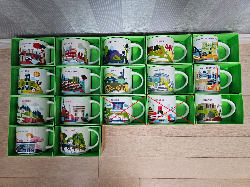 머그컵: 스타벅스 시티/유아히어/빈데어 시리즈, 스타벅스코리아 전부다 미사용입니다. 소장 보관하고 있던 거 내놓습니다. <1번째 사진>------------------------------------------------ 스타벅스 머그컵 유아히어 컬렉션(You Are Here collection), 414ml - 영국(ENGLAND) : 53,000원 - 영국 런던(LONDON) : 55,000원 - 영국 스코틀랜드(SCOTLAND) : 55,000원 - 영국 웨일즈(WALES) : 55,000원 - 영국 뉴캐슬어폰타인(NEWCASTLE UPON TYNE) : 55,000원 - 영국 옥스포드(OXFORD) : 55,000원 - 영국 캠브리지(CAMBRIDGE) : 55,000원 - 영국 에딘버러(EDINBURGH) : 55,000원 - 영국 리버풀(LIVERPOOL) : 55,000원 - 영국 맨체스터(MANCHESTER) : 55,000원 - 프랑스(FRANCE) : 48,000원 - 프랑스 파리(PARIS) : 50,000원 - 튀르키예 앙카라(ANKARA) : 53,000원 - 베트남 나트랑(NHA TRANG) : 38,000원 - 베트남 푸꾸옥(PHU QUOC) : 41,000원 <2번째 사진>------------------------------------------------ 스타벅스 머그컵 빈 데어 시리즈(BEEN THERE SERIES), 414ml - 일본 교토(KYOTO) : 39,000원 - 베트남(VIETNAM) : 38,000원 - 베트남 하노이(HANOI) : 39,000원 스타벅스 시티 머그컵, 473ml - 체코 오스트라바(Czech Ostrava) : 34,000원 - 체코 브르노(Czech Brno) : 34,000원 - 중국 심천(China Shenzhen) : 31,000원 스타벅스 시티 데미머그컵, 89ml - 모스크바(Moscow)/상트페테르부르크(St.Petersburg) 세트 : 97,000원 스타벅스 머그컵 인도네시아 시리즈(Indonesia Series), 473ml - 인도네시아 꾸따(Indonesia Kuta) : 30,000원 <3번째 사진>------------------------------------------------ 스타벅스 코리아 - 스타벅스 Reserve 머그, 473ml : 25,000원 - 스타벅스 그린 사이렌 스퀘어 머그, 473ml : 22,000원 - 스타벅스 사이렌 스트라이프 글라스, 455ml : 22,000원 - 스타벅스 사이렌 클래식 그린 머그, 355ml : 15,000원 - 스타벅스 (b) 그린 사이렌 도트 머그, 355ml : 17,000원 - 스타벅스 크림 사이렌 머그, 355ml : 15,000원 - 스타벅스앳홈 블랙 카푸치노 머그, 370ml : 15,000원 - 스타벅스앳홈 카푸치노 머그, 370ml : 15,000원 - 스타벅스 (b) 카키 사이렌 머그, 355ml : 19,000원(사진추가예정)