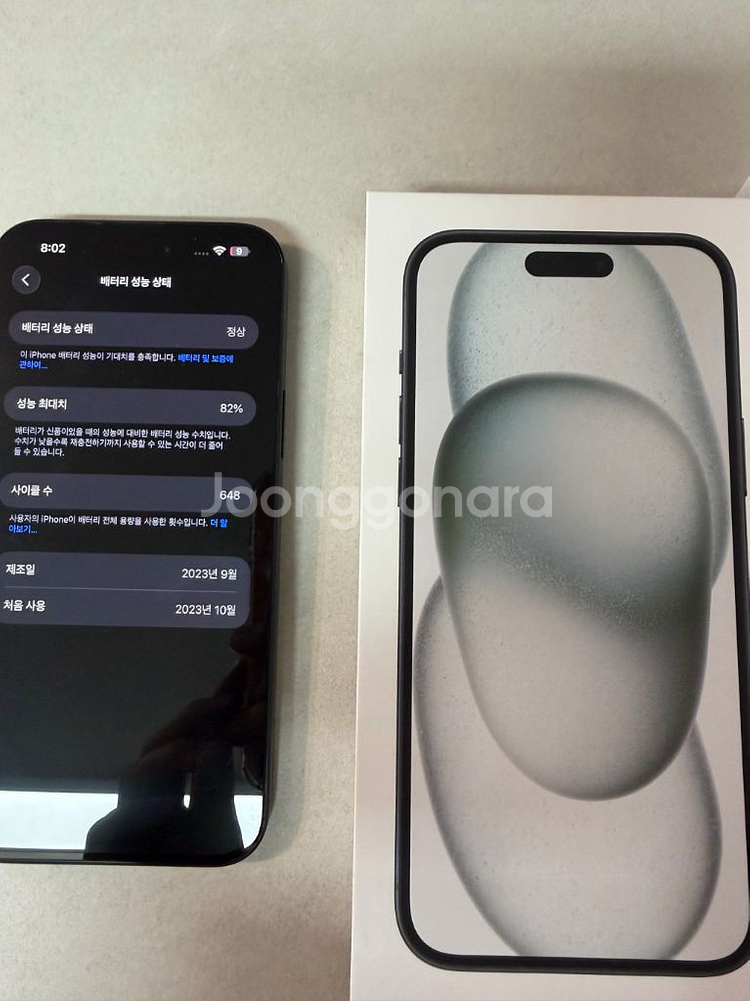 개인정보(거래정보)를 주고받는 행위는 사기에 노출될 수 있으므로 즉시 중고나라로 신고해 주세요모델명아이폰 15 플러스 128GB컬러블랙아이폰 15플러스 블랙색상입니다. 128G이고 배터리 성능은 82%입니다. 2년 조금 넘게 사용하였습니다. 사용할 때 케이스와 필름을 항상 착용하여 앞,뒷면은 깨끗하고 옆면은 생활기스와 작은 찍힘이 몇군데 있습니다. 박스는 있습니다!
