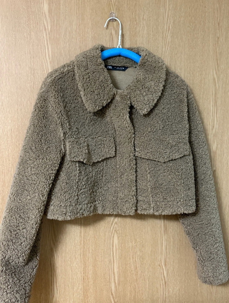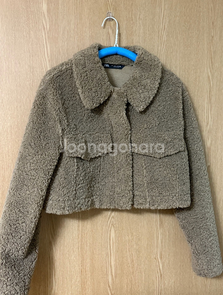 자라 뽀글이 시어링 크롭 자켓 M 사이즈입니다 브라운과 베이지 중간 정도의 따뜻한 색감이에요 사진처럼 옷걸이에 걸어 보관했고, 마지막 사진처럼 드라이클리닝 후 비닐에 씌워 보관해서 상태 깨끗합니다 시어링 부클 퍼 소재로 따뜻하면서도 스타일리시하게 연출하기 좋아요 캐주얼룩에 잘 어울리며, 크롭 기장이라 다리가 길어 보이는 효과도 있습니다