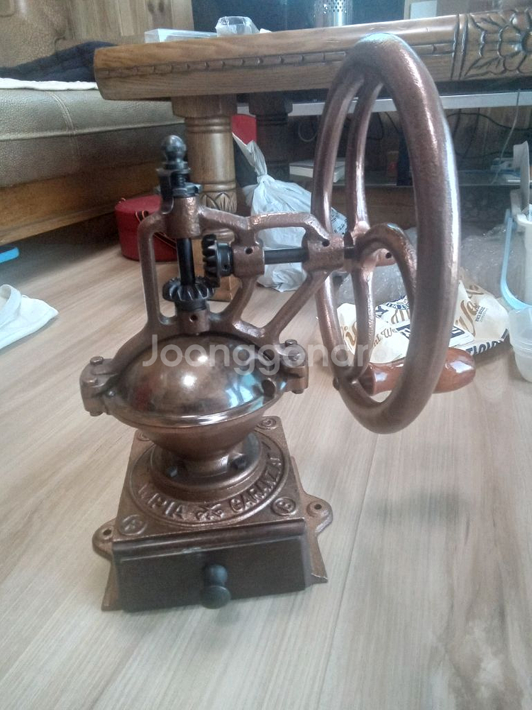 이태리 빈티지 커피그라인더 입니다. 재팬24에서 경매로 구매했으며.이태리 유명한 커피그라인더/커피밀 중형급 입니다. 전체 주물로 제작.구리색 고풍의 멋을 지닌 상태좋고.년식 오래된 고품격의 모습입니다. 위엄있는 포지션에 무쇠의 질감이 좋은.... 원두커피 미세입자 그라인딩 좋습니다. 커피 메니아분.커피 관련업종.사업 오너분들이 욕심낼만한 커피 그라인더로.박물관 전시용.커피점.가구점.유흥업소의 장식성등 소장의 자부심도 함께 할겁니다.가로/세로/높이/휠폭.20.20.32.23. 직.택배거래 가능합니다.다만 택배거래시 안전거래는 하지 않겠습니다. 안전거래했다가 도리어 제가 피해를 본적이 두번이나 있어서.되도록 직거래를 원하며.택배거래만 가능한경우에는 저를 믿으시고.안전거래없이 거래하실분만 문의 주세요.택배료는5000원 별도이며.안전한 우체국 택배를 이용할겁니다.중고나라에서 사기칠만큼 .수준이 낮지도 경제적으로 어렵지도 않습니다.이게 어떻고.저게 어떻고.말많고.민감한 분들은 구매하지 마시고.서로가 깔끔한 거래 했으면 좋겠습니다.