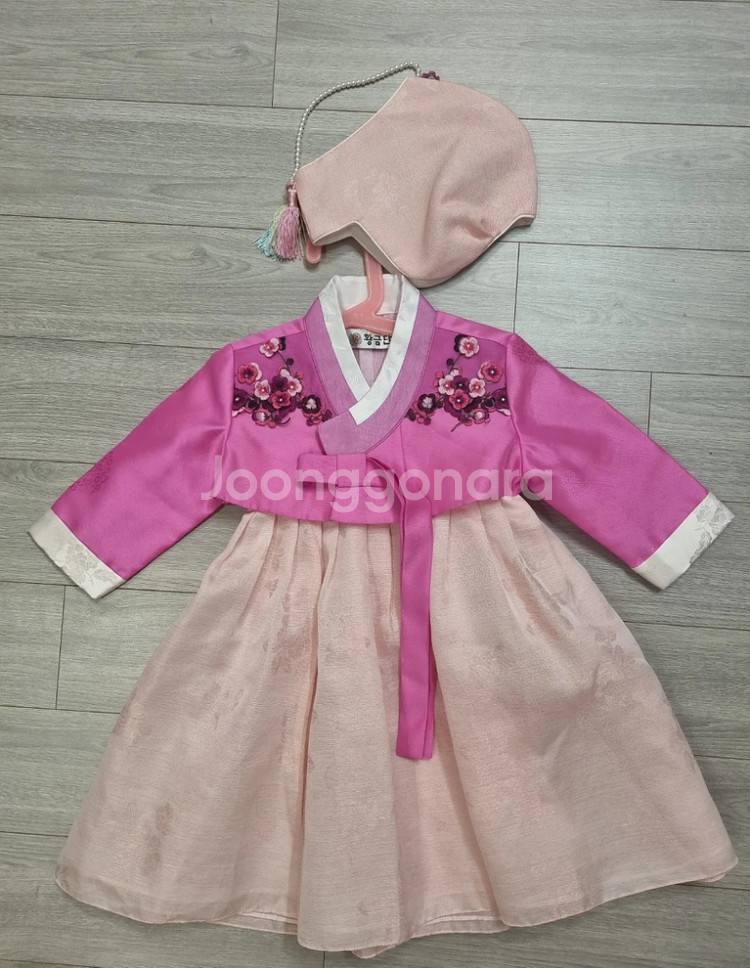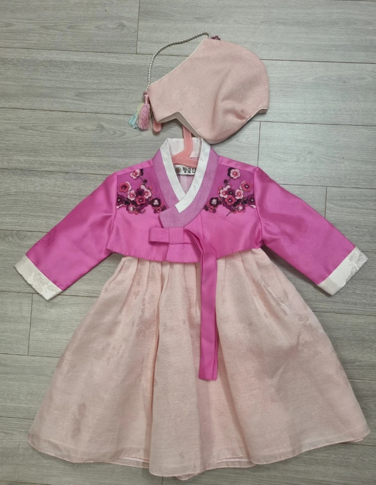화사한 핑크색이 예쁜 여아 한복 2호 판매합니다. 족두리까지 세트입니다. 첫째딸 18개월쯤 한번 입혔고, 둘째딸 21개월에 입혔는데 20개월 넘어가니 기장이 조금 짧네요. 치마 길이를 어깨끈으로 조정할수 있어서 사이즈 조절이 용이합니다. 저고리 고름도 어렵게 멜것 없이 고리에 끼우기만 하면 돼서 편리하구요. 전반적인 상태 괜찮으나 사진에서 보이는 것처럼 조바위 실밥 조금 풀려있고 뒤쪽 꽃장식 살짝 휘어있으니 참고 부탁드려요.
