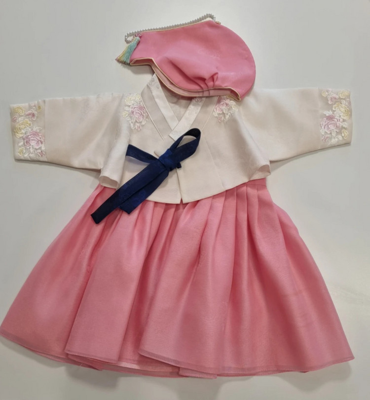 여아 100일 사진 촬영할때 입히기 좋은 백일한복입니다. 치마, 저고리, 조바위 구성이고 색감 화사해서 정말 예쁘고 귀엽습니다. 3.4.5번째 사진에 각각 조바위 수술부분 실풀림, 치마 뒤쪽 찍찍이 여밈 아랫부분 찢김, 치마 앞쪽 하단 얼룩 이정도 하자사항이 있습니다만 사진 찍으면 티는 안 날거에요. 저희딸 백일상 사진 참고차 올립니다.