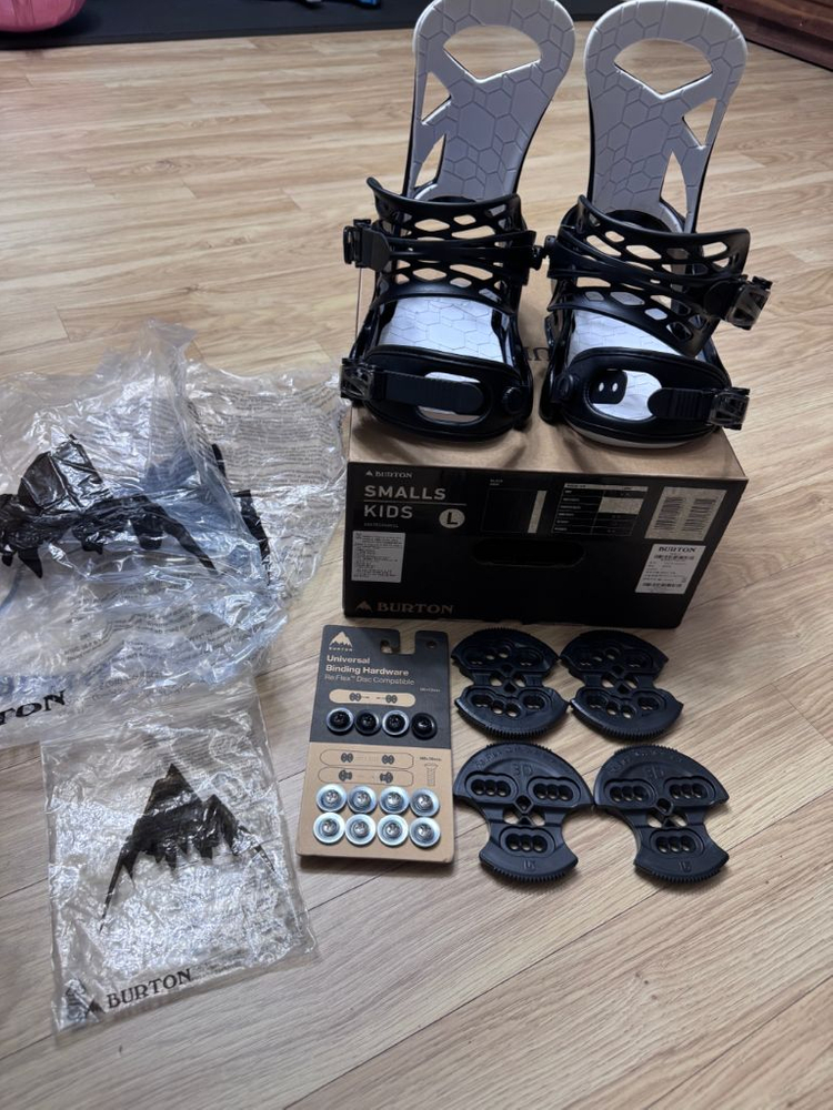 버튼 키즈 스몰스 바인딩 L사이즈 입니다 풀박스로 모든 구성품 포함 입니다 220부터 250사이즈까지 사용 가능해요 새제품 구입 후 한시즌만 3번 타서 상태 매우 좋아요 무료 배송으로 판매 합니다