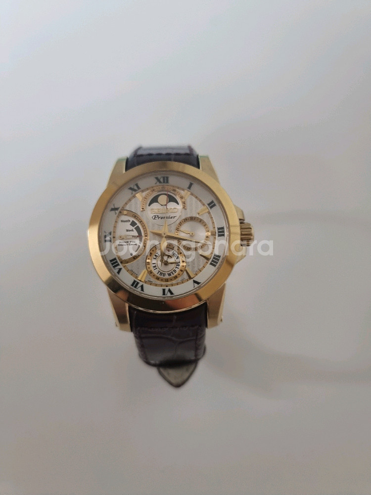 프리미어 무브먼트 시계예요. 골드 케이스와 브라운 가죽 스트랩으로 고급스러운 느낌이 물씬 나는 제품입니다. 상태 양호하고 작동 잘 되는 좋은 시계네요! 구입후 한두번 사용 거의 사용하지 않았습니다. 년식대비 거의 새거. 구성품은 없으며.삼정시계 정품 보장. 문자로 문의 주세요