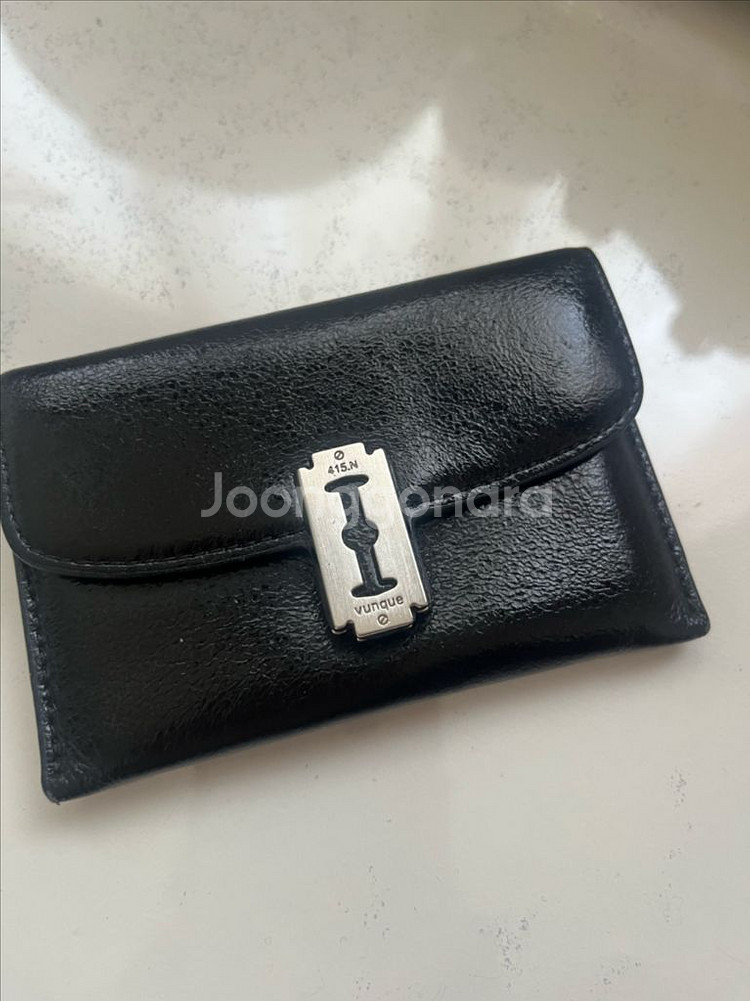 블랙 가죽 카드지갑이에요. 실버 메탈 잠금장치가 포인트이고, 전체적으로 깔끔한 상태입니다. 심플하면서도 고급스러운 디자인이 매력적이에요. 사진상태는 사진참고요~ 교환반품불가~