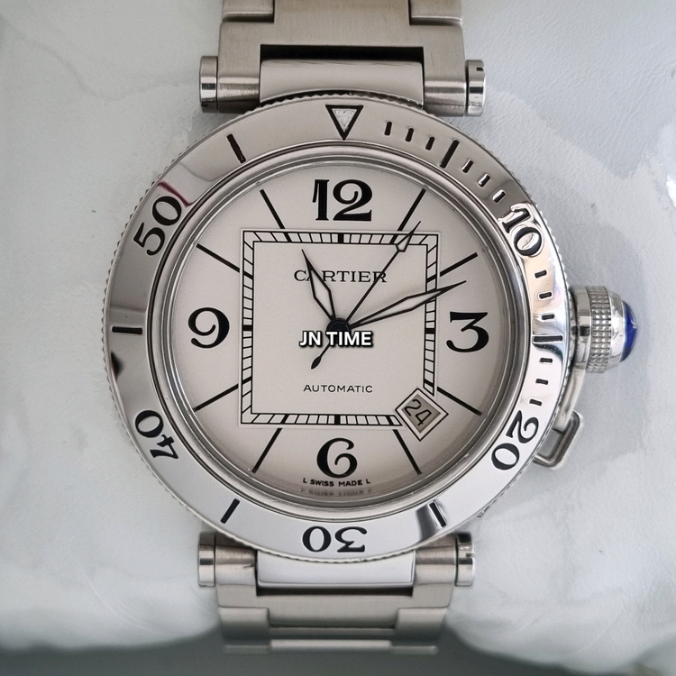 이번에 소개시켜 드릴 시계는 까르띠에 구형 파샤 모델로 남성용으로 가장 인기 사이즈 40mm 모델입니다. 남성용이 35mm,38mm도 있지만 작아서 그런지 40mm 대비 100~150 낮게 거래되고 있으니 참고하세요. 까르띠에 상위 라인 중 발롱블루,펜더, 산토스 라인보다는 인기가 덜 하지만 유니크한 디자인 때문에 그런지 찾는 분들이 제법 많습니다. 그래서 10년이나 단종 된 모델이 2020년 제출시가 된것 같습니다. 파샤는 1985년 새롭게 출시된 클래식 워치메이킹을 뛰어넘는 다양한 요소들이 어우러져 더욱 강렬한 독창성과 매력을 선사합니다. 원형 케이스와 아라비아 숫자,원형 케이스 내부의 정사각형,다이아몬드 모양 핸즈에 파샤에 상징인 체인형 크라운 보호장치가 매력적인 모델입니다. 현재 신형은 1050만원인데 구형도 단종 직전 리테일가는 840만원으로 까르띠에서 상위 라인에 속합니다. 그리고 보통 파샤 중고 올라오는게 35mm가 대부분이고 보증서도 없는게 보통인데 제가 올린 모델은 40mm고 보증서 포함 구성품 풀셋이고 해외에서 구입할때 상품화가 된 상태로 구입해서 상태도 아주 깨끗합니다. 그런데 오차가 있어서 2023년 9월 13일에 믿을만한 사설업체 통해서 오버홀 했습니다. 구입하시면 매장 게런티 카드에 오버홀한 날짜와 업체명 그리고 번호까지 따로 적어 드리겠습니다. 앞으로 5년은 돈 들어갈 일 없을겁니다. 고민하는 순간 팔리고 없으니 빠른 초이스 해주세요. 모델번호 - W31080M7 사이즈 - 40mm 무브 - 오토 구입시기 - 2009년 상태 - 새제품 대비 94% 리테일가 - 840만원대 구성품 - 박스,보증서,책자,여분링크 줄길이 - 20.5cm(풀 링크) ## 2021년부터 현재까지 중고나라에서 셀러회원으로 활동 중인 JN TIME입니다. (네이버에 상호 검색하면 위치와 번호 나옴) 매장으로 오시면 매입된 제품은 카드결제나 현금영수증 가능합니다. (일부 위탁판매 제품은 제외) 단 택배는 선입금 택배거래만 가능합니다. (안전결제 불가!!) 그리고 판매 금액이 감정이나,수리,상품화 같은 비용이 포함되었어도 개인 간 판매되는 금액 수준이라 에누리는 어렵습니다. 교환이나 에누리 문의 주시면 따로 답장하지 않겠습니다. 제품 구입 관련 문의만 부탁드립니다.