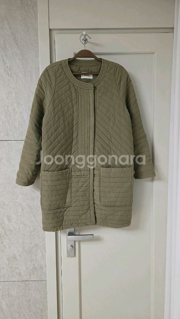 퀄팅 디자인의 카키색 롱패딩이에요. 앞면과 뒷면 모두 퀼팅 패턴으로 되어있고 포켓도 있어서 실용적이에요. 상태 양호한 중고 제품입니다. 가슴53 총장 83