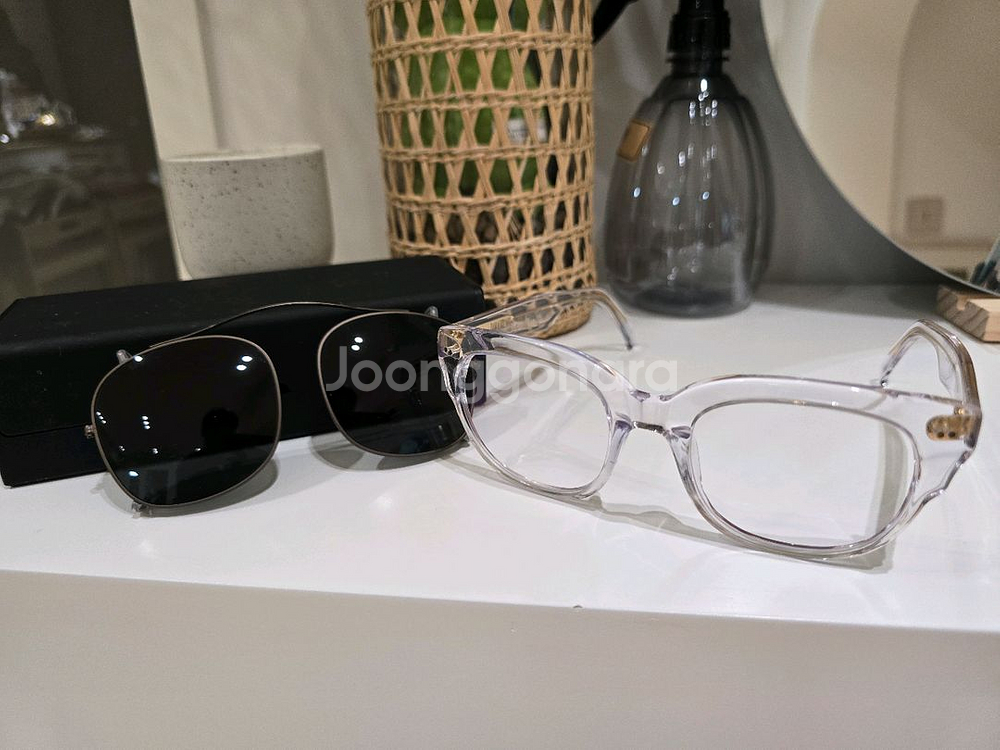 클리어 프레임에 블랙 렌즈가 매력적인 선글라스예요. 케이스와 함께 깔끔한 상태로 보관되어 있어서 상태 좋습니다. 세련된 디자인으로 어떤 스타일에도 잘 어울려요.