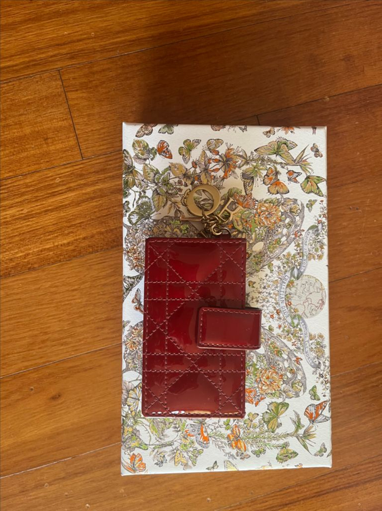 시그니처 퀼팅 패턴의 레드 컬러 카드지갑이에요. 골드 체인과 참이 달려있어서 키링으로도 사용 가능하고, 컴팩트한 사이즈로 실용적이에요. 상태 양호한 중고 제품입니다.