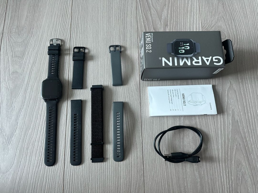 가민 베뉴 SQ2 스마트워치 블랙 색상입니다 - 박스, 충전 케이블, 추가 스트랩 포함입니다 - 전반적으로 사용감있으나 잘작동합니다 (사진 참고해주세요) Garmin Venu Sq 2는 AMOLED 디스플레이로 생생한 시각적 경험을 제공하며, 건강 모니터링 기능으로 건강 관리에 도움을 줍니다 또한, 가벼운 무게로 편안하게 착용할 수 있습니다 가민의 일반적인 디자인에 아직은 거부감이 있으신분들이 입문하기 좋습니다. 4세대 센서를 사용하여 확실한 심박 확인, 혈중 산소포화도 측정, 수면추적등이 가능합니다. 같은 가격에 구할 수 있는 포러너 시리즈 보다 훨신 윗등급 하드웨어, 소프트웨어가 쓰이니 참고하세요.
