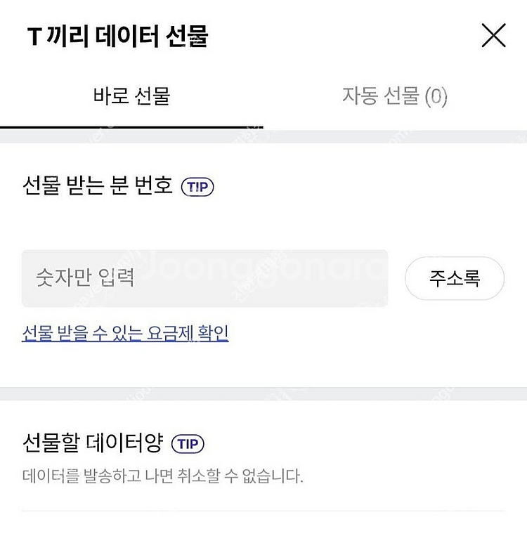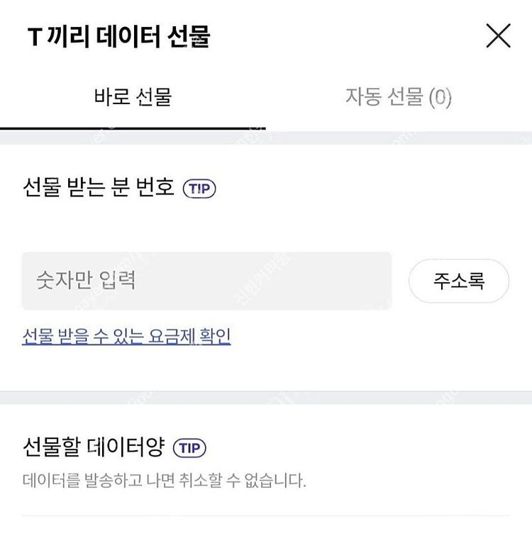 skt t끼리 데이터 선물하기 2기가 3천원에 판매