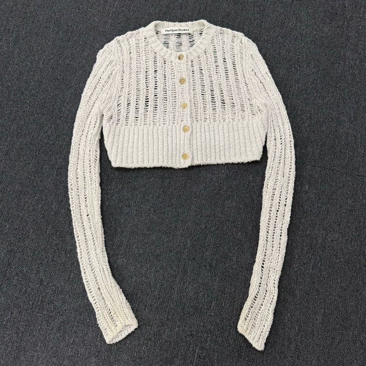 제품 : TheOpen Product 더오픈프로덕트 크롭 니트 가디건 Price : 60,000 Size : F (1) 총장 : 41 어깨 : 43 가단 : 50 소매 : 80 - 소매와 두번째 단추부분 이염 (사진참고) -아이폰 13 pro max 촬영. -빈티지 특정상 발견 못 한 이염이 있을수 있습니다. -빈티지 특정상 교환/환불 불가.