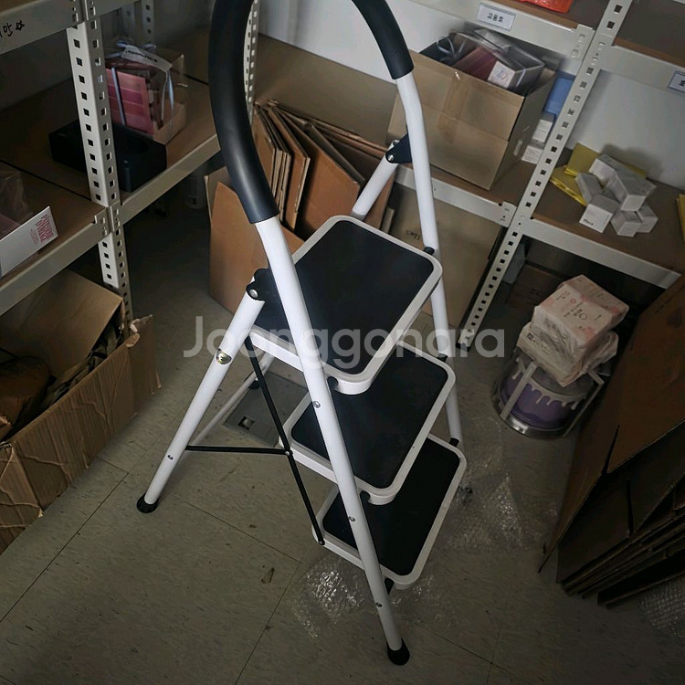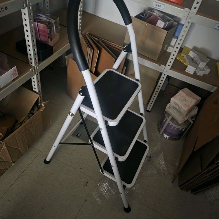 3단 접이식 사다리입니다 가정에서도 사용하기에 적합하며, 흰색 프레임과 검은색 발판으로 구성되어 있습니다