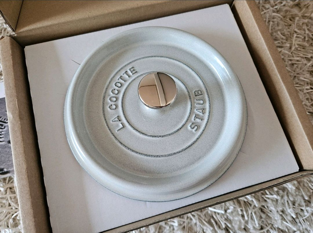 25년 12월 신세계 센텀점에서 구매했습니다 미사용 새상품 풀박스로 택비별도 20만원입니다 스타우브 원형 꼬꼬떼 화이트 트러플 20cm