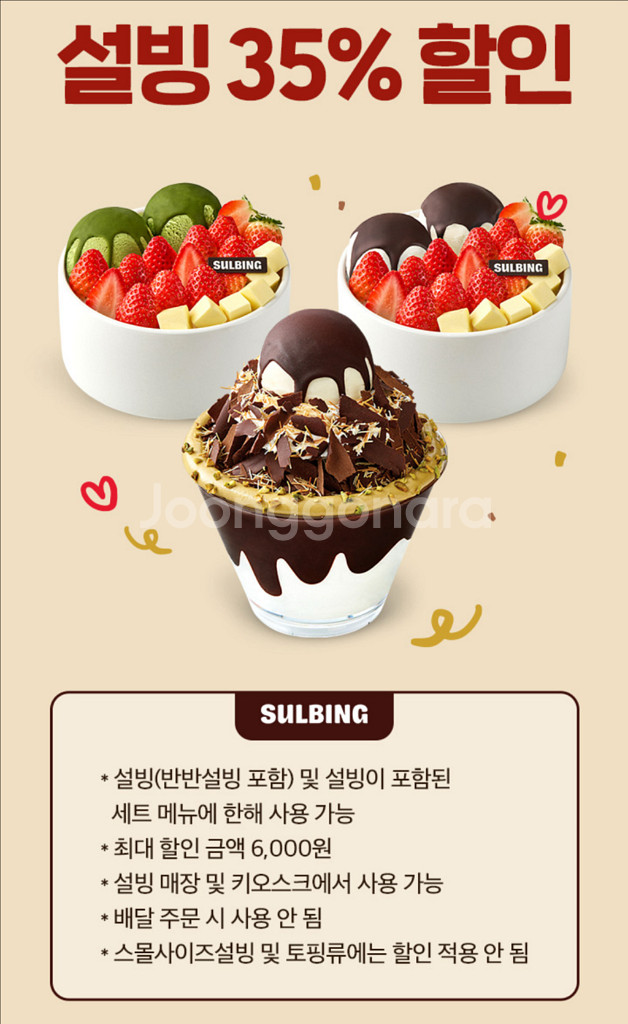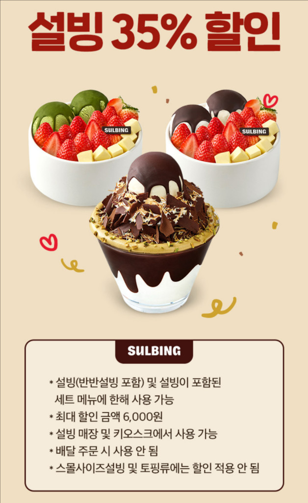설빙 35% 할인쿠폰입니다. 최대할인 금액 6,000원 설빙 매장 및 키오스크에서 사용 가능 📌배달 주문 시 사용 불가 📌사용기한: 2026.03.06. 📌쿠폰 사용 방법 올려놓은 사진 확인 바랍니다. 입금확인 후 쿠폰 바로 보내드립니다!