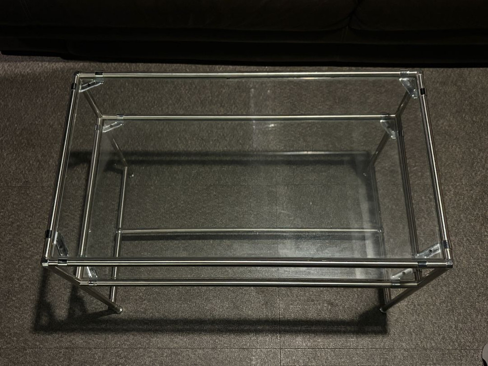 실버 프레임 미드센츄리 유리 테이블입니다. 논현동에서 직접 거래 가능합니다