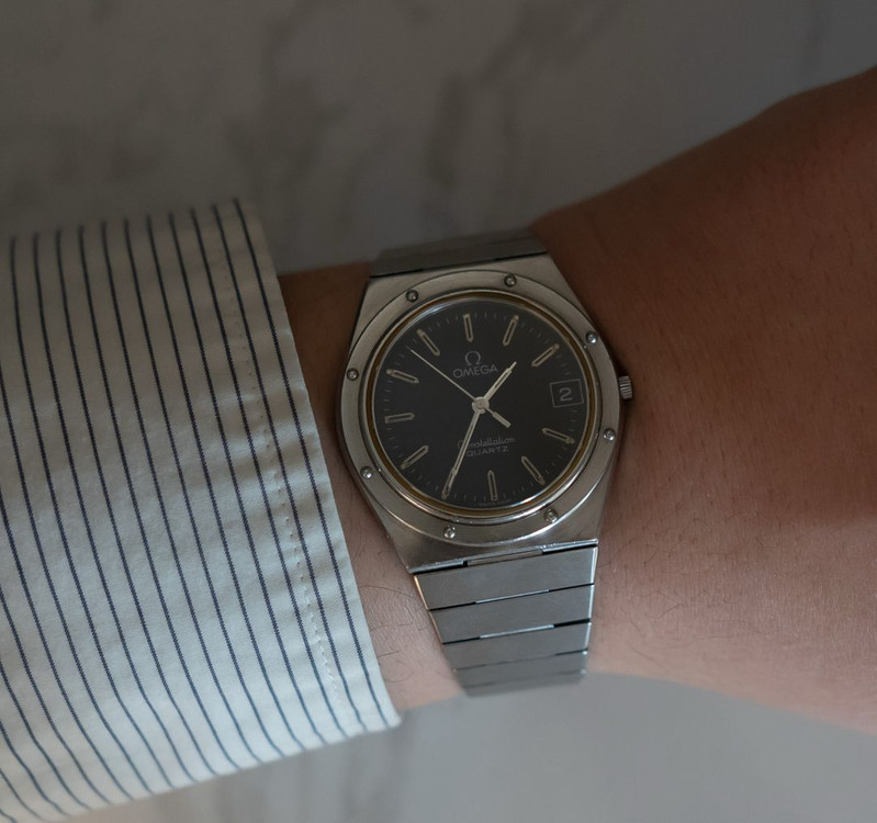 사이즈: 35mm 무브먼트: 쿼츠 (배터리) 케이스 및 브레이슬릿: 스테인리스 스틸 구성품: 시계 본품 설명 젠타(Gérald Genta) 감성이 녹아 있는 오메가 컨스틸레이션 마리너 라인으로, 로얄오크와 매우 유사한 팔각 베젤과 브러싱 마감이 특징인 매우 희귀한 빈티지 모델입니다. 이 모델은 1979년부터 1983년까지 단 4년간만 한정 생산된 레퍼런스로, 해외에서도 매물 자체가 거의 존재하지 않아 수집가들 사이에서 높은 평가를 받고 있습니다. 베젤 나사 디테일과 일체형 브레이슬릿 구조는 젠타 디자인의 상징적 요소를 그대로 보여주며, 오메가가 로얄오크·노틸러스 등 고급 스포츠 워치 트렌드에 대응해 제작한 대표적인 역사적 작품입니다. 📍 경기도 구리 직거래 / 택배·퀵 거래 가능 ❌ 네고 문의 받지 않습니다