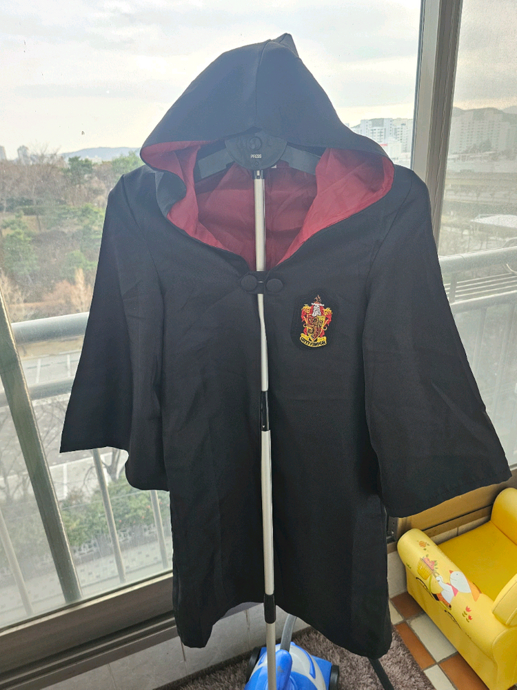 해리포터 그리핀도르 마법학교 의상이에요. 후드와 안감이 빨간색으로 되어있고 그리핀도르 엠블럼이 달려있어요. 상태 양호한 중고 제품입니다.