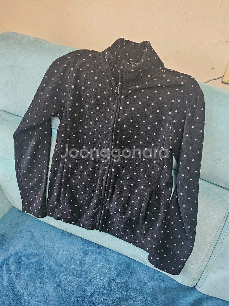 85사이즈 도트 패턴 플리스 집업이에요. 네이비 바탕에 화이트 도트가 포인트로 들어가 있어서 깔끔하고 예뻐요. 상태 양호한 중고 제품입니다.