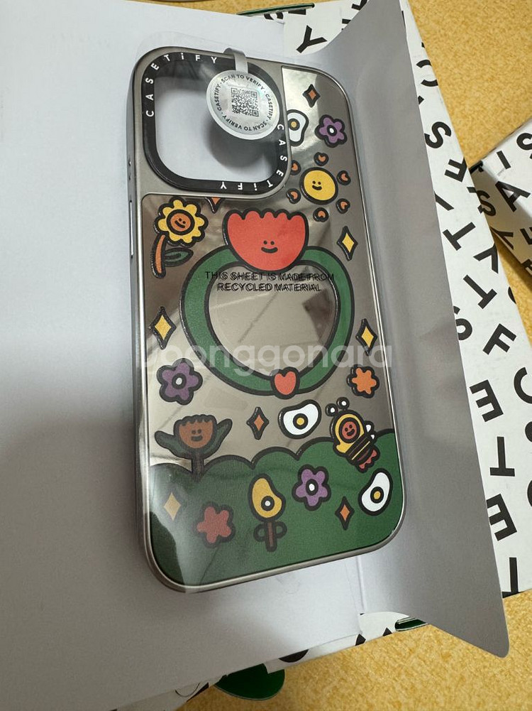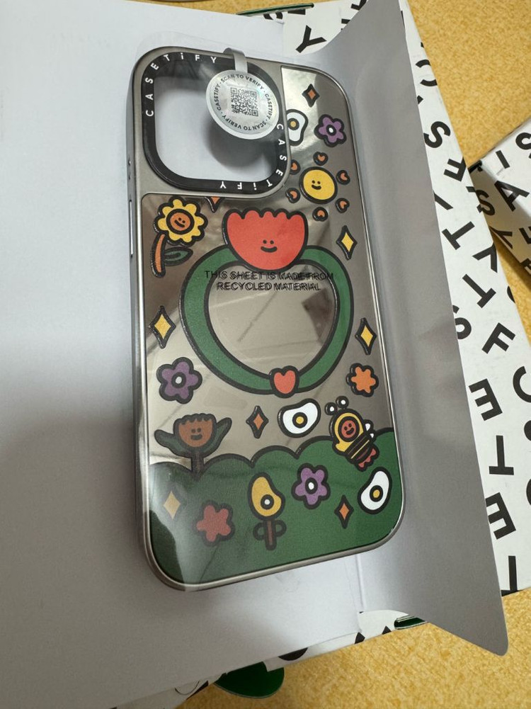 아이폰15프로 GARDEN BY SHAO 정품 케이스입니다. 은색 테두리에 귀여운 그림이 그려져 있습니다. MagSafe 지원되는 미러 케이스입니다.
