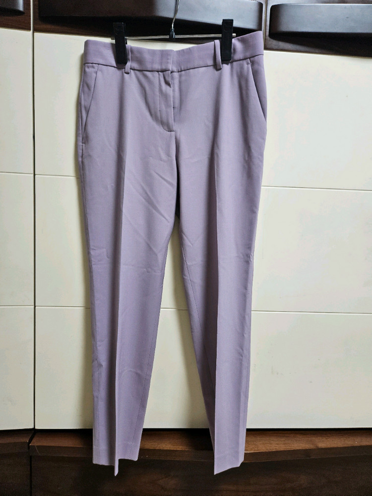 Theory 띠어리 여성 슬랙스 팬츠!! 은은한 라벤더 색상으로 2사이즈이며 울 96%, 엘라스테인 4% 혼방 소재로 부드러운 촉감과 깔끔한 디자인으로 다양한 상의와 코디하여 입기 좋아요.. 55--66사이즈 괜찮아요. 총장길이 87