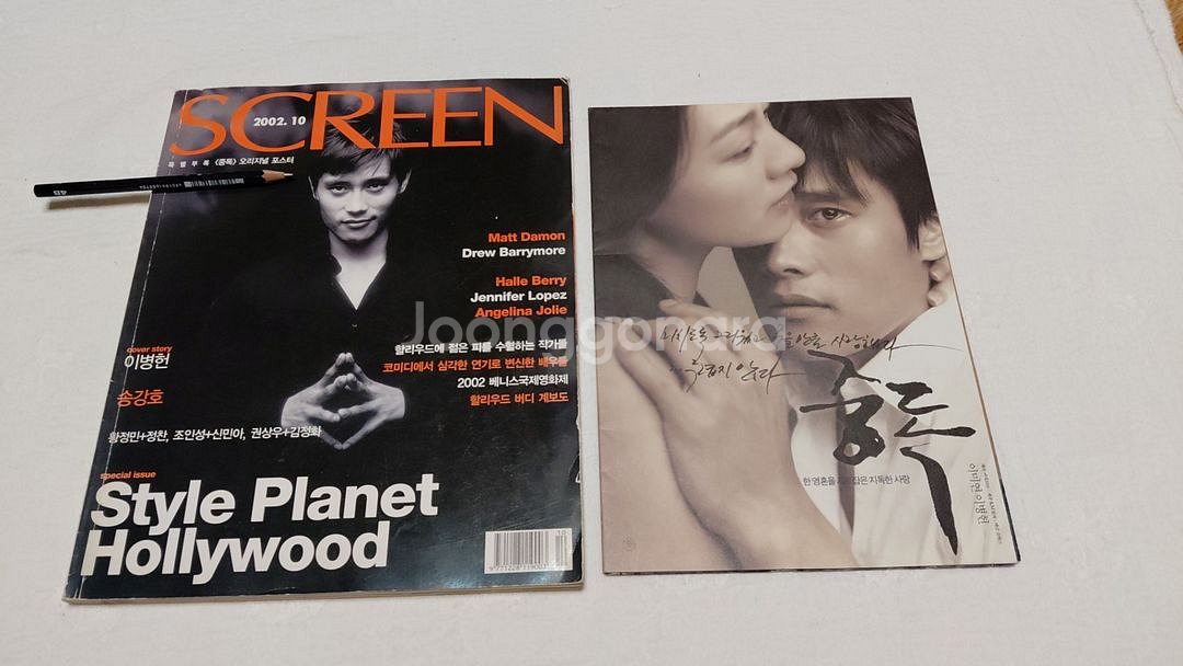 1ㅡ 스크린 ㅡ 3만8천원 잡지 표지 연필 올려놓은곳에 글씨가 써 있습니다 모서리 까임이 있습니다 2ㅡ 중독 포스터 포스터형 ㅡ 3만2천원 새것 그대로 보관되었습니다