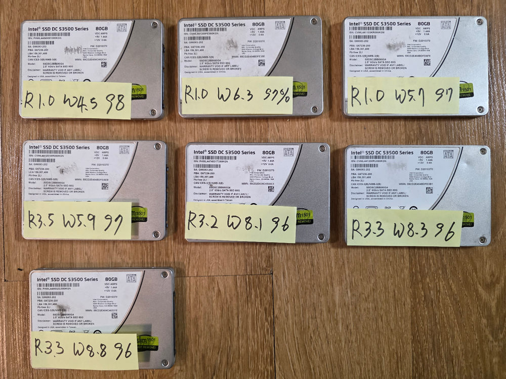 인텔 MLC SSD S3500 80G 모델입니다. 크리스탈 인포 기준 전부 96% 이상의 컨디션을 가지고 있습니다. 사진속 읽기, 쓰기량은 T테라 단위로 표기해 두었습니다. 거래이력 많고 단 1번도 문제이르킨적 없습니다. * 일괄 시 개당 천원할인 + 택배비 제가 부담하며 그 이상 네고는 사양합니다.