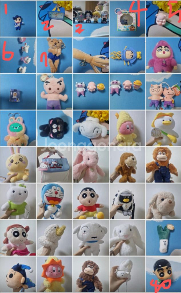 인형뽑기로 뽑았던 인형 다수 (총57개) 판매합니다 10,000원 이상부터 거래가능합니다! 많이 사면 에누리 가능하니 채팅주세요 1. 꿈꾸는세계 철수 피규어 2,000원 2. 짱구는 못말려 액션가면 알람시계 피규어 2,000원 3. 귀멸의칼날 탄지로, 젠이츠, 이노스케, 우즈이텐겐, 카나오 피규어 일괄 15,000원 4. 짱구는 못말려 손거울(안에짱아있음) 2,000원 5. 복숭아 돼지 피규어 500원 6. 댕댕이커플 말티즈 피규어 4개 일괄 1,000원 7. 손묶인 도둑곰 인형 1,000원 8. 오징어 인형 2,000원 9. 짱구는 못말려 춤추는 오징어 장난감 5,000원 10. 짱구는 못말려 초코비 라부부 소형 5,000원 11. 짱구는 못말려 쌀알피규어 흰둥이옷 500원 12. 부리부리 마왕 인형 1,000원 13. 짱구는 못말려 부리부리 마왕 흰색 1,000원 14. 복숭아 돼지 유치원+천사돼지 일괄 1,000원 15. 부리부리 마왕 인형 정품 개당 2,000원 * 16. 와사비베어 초록 소형 2,000원 (판매완료) * 17. 검은고양이 핀 1,000원 (판매완료) 18. 짱구는 못말려 흰둥이 인형 소형 2,000원 19. 작은별 인형 중형 5,000원 20. 오리인형 2,000원 22. 우사기 인형 중형 7,000원 23. 헬로키티 가방 7,000원 24. 분홍 토끼 인형 중형 2,000원 25. 바다물개 인형 1,000원 26. 오랑오랑 중형 인형 갈색 7,000원 27. 미피 닮은 토끼인형 중형 2,000원 28. 도라에몽 인형 가방 7,000원 29. 짱구 인형 중형 2,000원 30. 양털 오리 가방 2,000원 31. 돼지토끼 가방 5,000원 32. 유리 인형 중형 2,000원 33. 짱오락실 털 오리 인형 3,000원 34. 흰둥이 인형 가방 7,000원 35. 토끼 인형 중형 흰색 2,000원 36. 대파 인형 소형 1,000원 37. 잠옷 철수 인형 중형 2,000원 38. 작은별 인형 햇님 중형 5,000원 39. 오랑오랑 중형 인형 짙은갈색 7,000원 40. 흰둥이 미니 크로스 가방 7,000원 42. 잠옷짱구 흔들흔들 2,000원 43. 짱구 미니 주머니 가방 5,000원 44. 짱구 라부부 원숭이 5,000원 45. 짱구 액션가면 가방 피규어 2,000원 46. 짱구 파우치 잠옷버전 3,000원 47. 양파쿵야 인형 2,000원 48. 돼지인형 1,000원 49. 구데타마 인형 3,000원 50. 고추인형 1,000원 51. 짱구는 못말려 잠옷 수지 피규어 스탠트 5,000원 52. 대패 웃는 인형 1,000원 53. 옷 물어뜯는 짱구 피규어 2,000원 54. 3분대작전 짱구 미니 피규어 3,000원 55. 짱구 미니 피규어 인어공주 3,000원 56. 농담곰 줄자 피규어 7,000원 57. 짱구 고양이 미니 피규어 2,000원