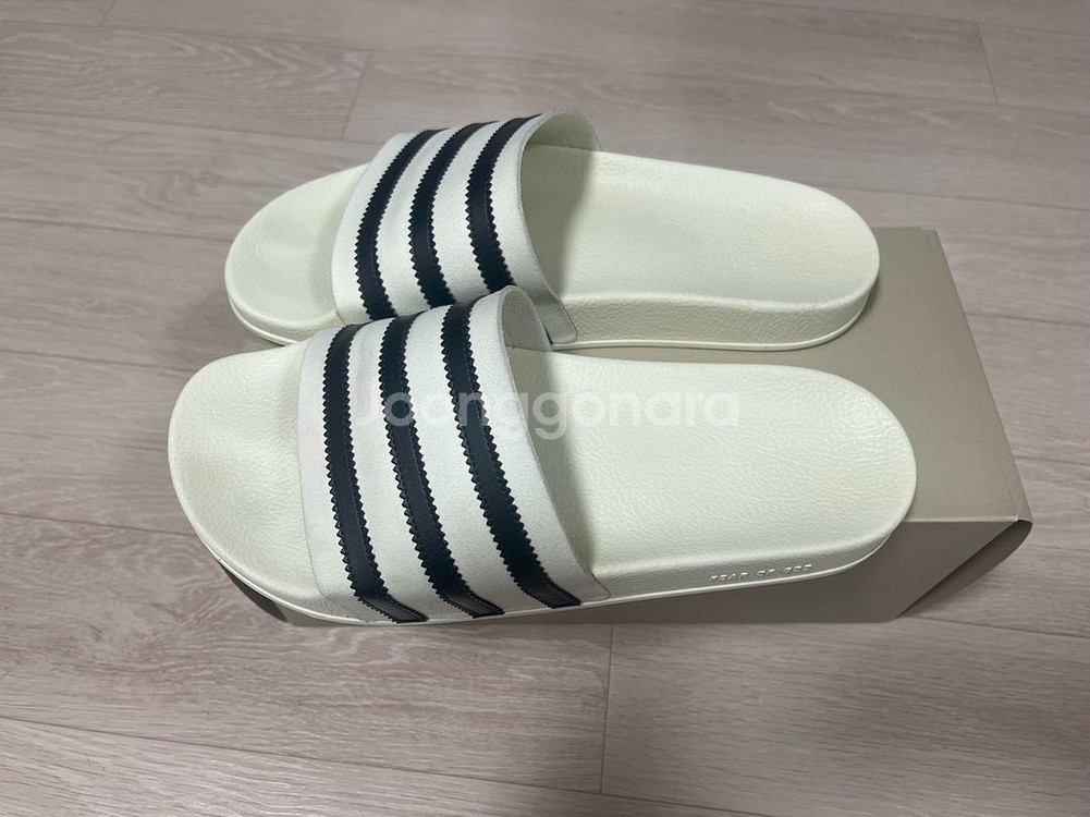 피어오브갓 x 아디다스 아딜렛 슬리퍼 265 사이즈 판매합니다 제리로렌조가 직접 참여한 컬렉션으로 정가 119,000원에 금방 품절되었던 고급스러운 슬리퍼에요 집앞에 2번 신고 나갔습니다 사용감 전혀없이 거의 새제품이에요 살짝 작게 나와서 255~260 정도 신으면 잘 맞겠습니다 박스와 택 모두 있는 풀세트입니다