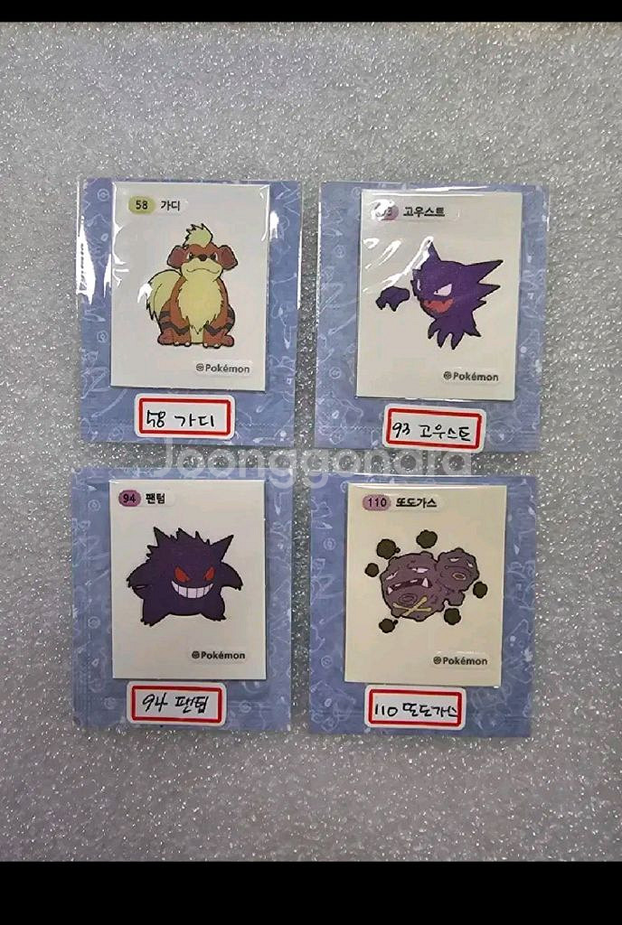 포켓몬 띠부씰 정식 오류씰 가디, 고우스트, 팬텀, 또도가스 개봉/미개봉입니다. 씰 관리를 잘해서 상태 좋은 편이고 심한 오염, 구김 없습니다. 매너 거래 부탁드립니다.
