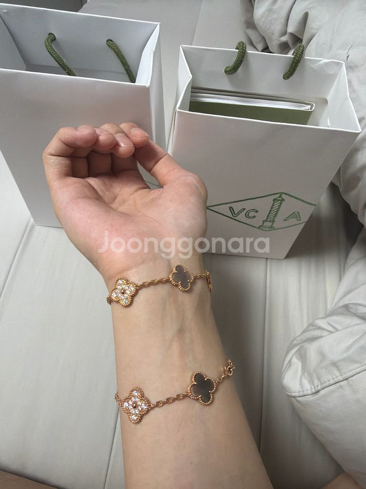 반클리프 팔찌 입니다 18k 이구 랩다이아 입니다 풀구성품입니다. 각인이랑 완벽하구요. 개당 430 주고 맞추었는데 공임비 빼면 700이면 적당하다 생각듭니다. 맞춘지 2주 되었는데 집순이라 3번 찻네요 ㅠ 구성품 사진이나 자세한건 연락주세요 17.5cm