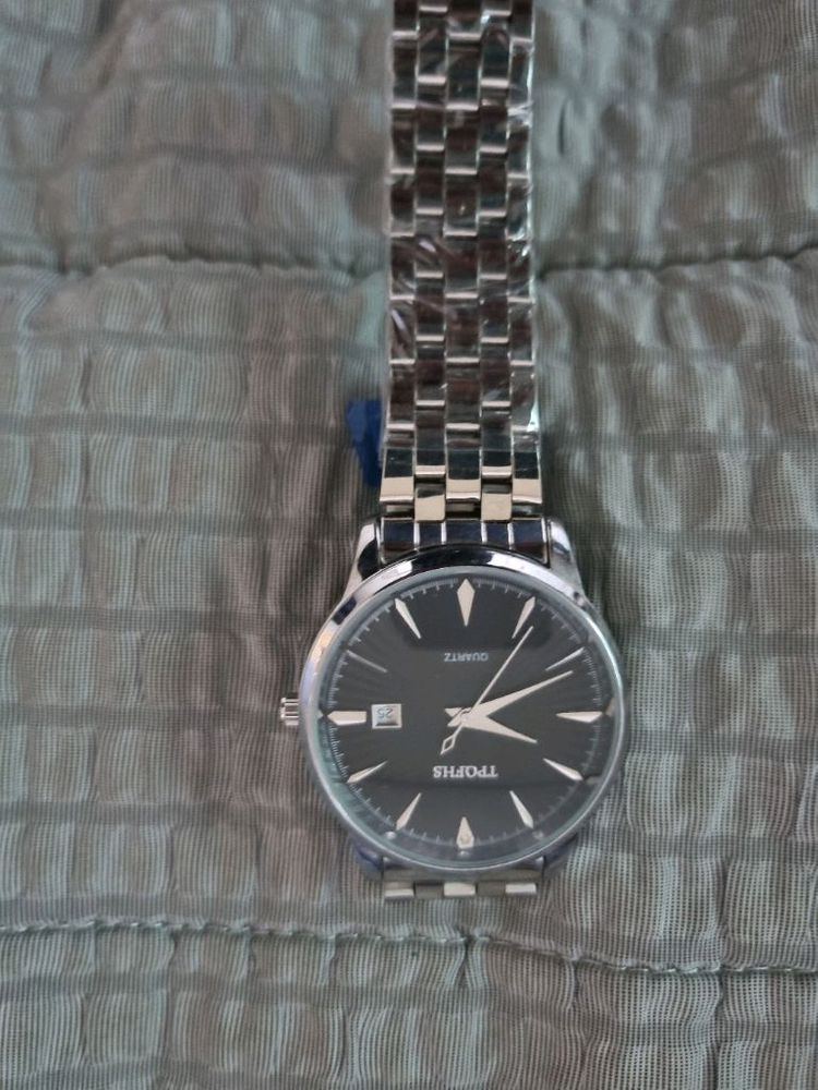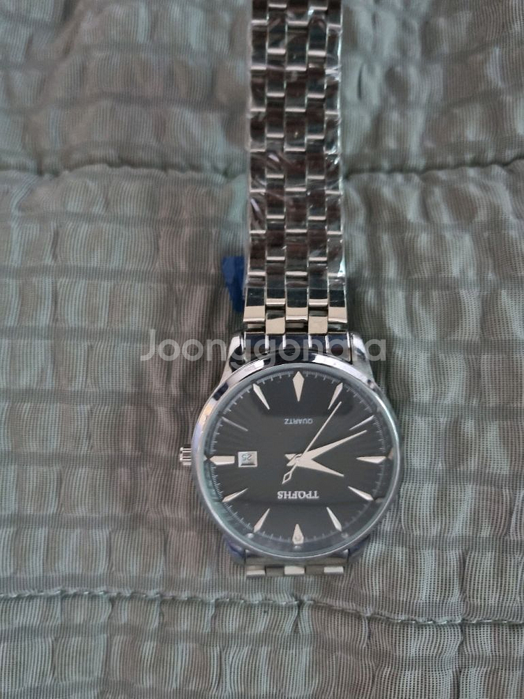 실버 스테인리스 스틸 케이스와 브레이슬릿이 고급스러운 남성용 시계예요. 블랙 다이얼에 화살표 인덱스가 깔끔하고 세련된 느낌을 줍니다. 전체적으로 상태가 양호해 보이는 제품입니다.