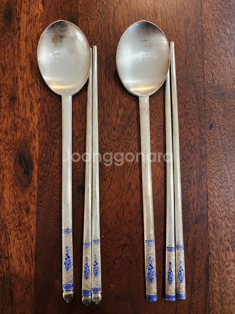 은수저 세트 판매합니다. 한벌당 가격입니다. 첫번째 사진에 있는 은 99.9% 2인 세트 : 1,400,000 원 보관 중 변색이 됐는데, 세척은 일부러 하지 않았습니다. 두번째 사진에 있는 99% 1인 수저 : 720,000원 서로간에 사기 방지를 위해 3호선 도곡역 부근에서 현금 직거래만 합니다. 그 외에 다른 형태의 거래는 하지 않겠습니다.
