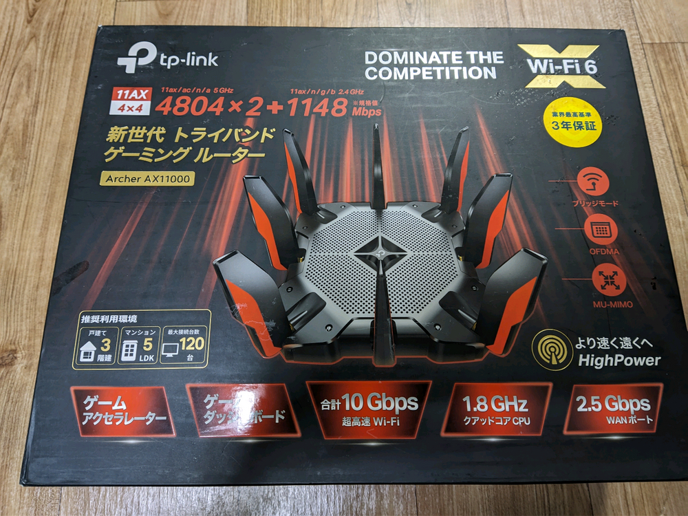 TP-Link Archer AX11000 Wi-Fi 6 게이밍 공유기 판매합니다. 일본에서 구매하였는데 사용하고자 하는 용도에 맞지 않아 판매합니다. 박스 포함 풀 구성품으로 상태 매우 양호합니다. 110V 제품으로 별도 변환 플러그 필요합니다. 스펙 하단 링크 참고 부탁드릴게요. https://m.danawa.com/product/product.html?code=16978853&cateCode=112804
