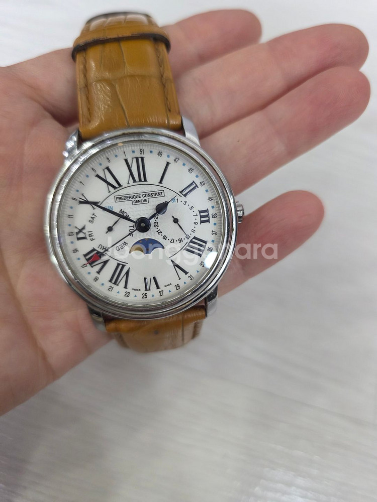 프레드릭 콘스탄트 타이머 멀티 문페이즈 가죽 시계 판매합니다 남성용 시계이며 가죽은 송아지 가죽입니다 글라스는 긁힘 방지가 되는 사파이어글라스이며 배터리는 교체 하셔야하고 사용감 있으니 사진을 참고해주세요 시계알 사이즈 4cm 둘레는 약 18cm입니다 보증서 케이스는 없습니다