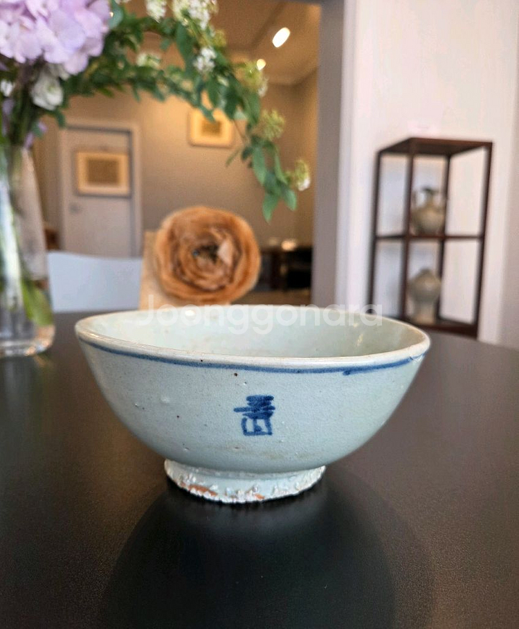 구연은 직구이고, 동체의 외측면선이 완만한 사선을 이루면서 저부로 갈수록 좁아드는 형태의 발입니다 발의 외측 구연 아래에는 청화로 선을 두르고 그 아래 삼면에 목숨 수자를 시문하였으며, 내저면에도 청화가 시문되었습니다 목숨"수"자는 장수를 기원하는 의미에서 시문하는 경우가 많은데 여기에서는 글자가 도안화된 모습입니다 이렇게 도안화된 문자로 볼때 양구지역 칠전리 일대로 추정이됩니다 태토는 잡물이 약간 보이고, 갈색빛이 도는 백색을 띠며, 유약은 청백색의 투명 유 입니다. 굽은 높고 접지면에 유를 닦고 모래를 받쳐 번조하였습니다 전반적으로 상태가 양호하며 전 끝부분에 밖으로만 튐수리를 하였습니다 제원: 구연부 17.2cm x 높이 7.7cm