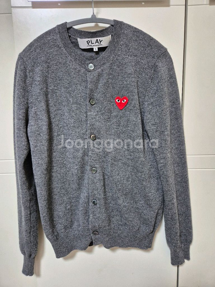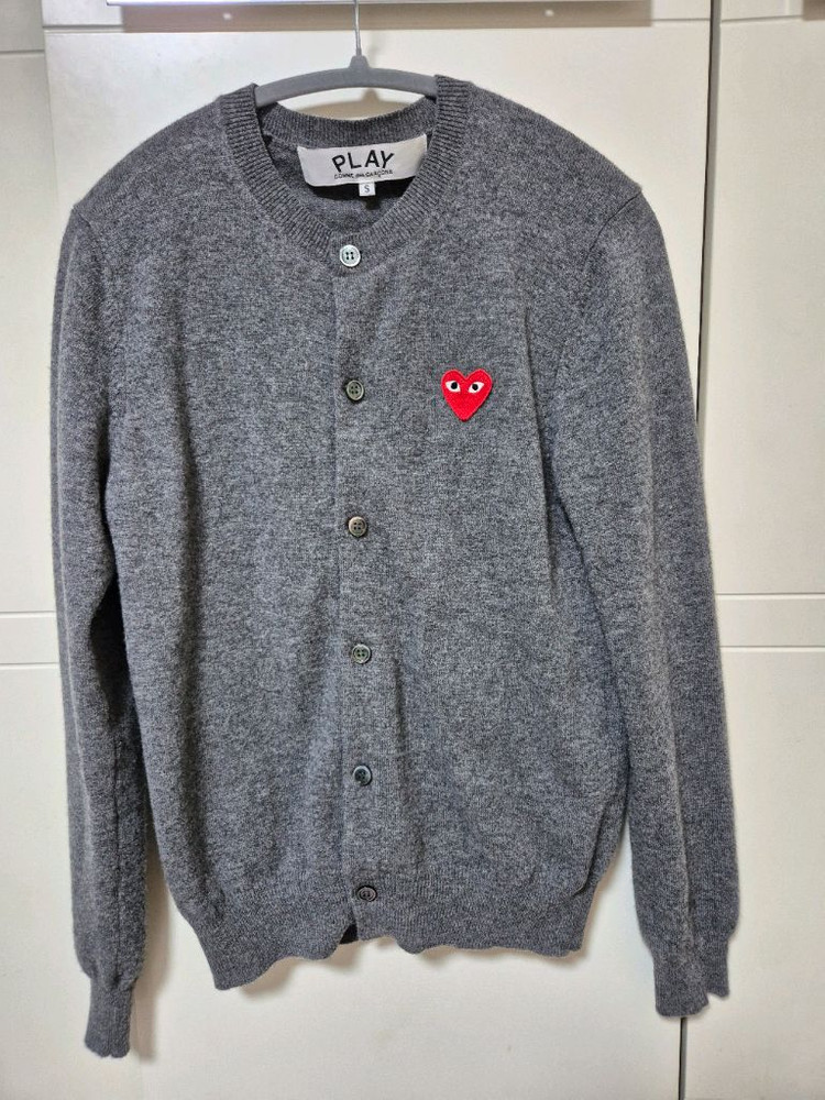 꼼데가르송 차콜색 가디건 S사이즈입니다. 남녀 공용으로 귀여운 빨간 하트가 포인트입니다. 두세번 입었어요. 가디건이 안 어울려 내놔요. 여성 66~77분들 좋으세요. 상태 좋은 제품 저렴하게 판매합니다! 문의 없으시면 안전결제 해주셔도 됩니다. 챗 주세요.
