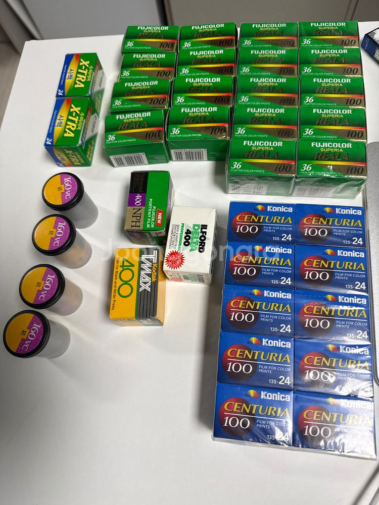 다양한 브랜드의 필름카메라용 필름들이에요. 여러 종류가 포함되어 있고 상태는 양호해 보입니다. 필름 사진 입문하시는 분께 좋을 것 같아요! 품목별 판매 가격] 1. Fujicolor Superia Reala 100 (36컷): 개당 40,000원 (수량 18개) 2. Konica Centuria 100 (24컷): 개당 18,000원 (수량 10개) 3. Fujicolor 400 NPH Professional (36컷): 30,000원 (수량 1개) 4. Kodak 160 VC (매거진): 개당 25,000원 (수량 4개) 5. Fujicolor Superia X-TRA 400 (24컷): 개당 12,000원 (수량 2개) 6. Kodak T-MAX 400 (36컷): 15,000원 (수량 1개) 7. Ilford Delta 400 Professional: 15,000원 (수량 1개) • 일괄 구매 시 금액 조율 가능합니다. 편하게 문의주세요. • 노출을 넉넉히 주고 촬영하시거나 수집용으로 활용하시길 권장합니다. • 직거래 및 택배 거래 모두 가능합니다. [거래 지역 입력] 대부분 2002-2005 년도 입니다 010462팔 이88칠