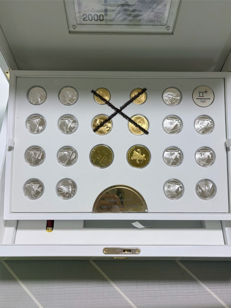 전체 사진으로 봤을때 양쪽 은화 15개 중간 황동화 2개 판매합니다 평창올림픽때 발행한 한정판입니다 개별 보증서 있고, 은화는 개당 15.55g=0.5온스 (순도99.99%) 황동화는 개당 26g (구리65%, 아연35%) 가격은 은화는 150,000x15개 황동화는 50,000x2개 2,350,000원입니다
