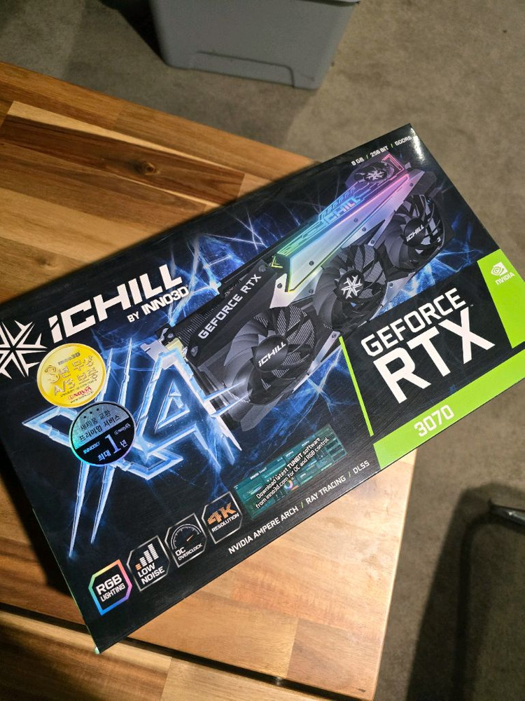 GeForce RTX 3070 그래픽카드입니다. 박스와 본체 모두 깨끗한 상태로 보관되어 있어요. 게이밍이나 작업용으로 성능 좋은 제품입니다. 엔비디아 그래픽카드 icill inno RTX3070 3팬 사무실 사용 에어건으로 먼지 털어놓음 AS기간 끝남 쓸대없는 소리X 찔러보기 X 충분히 고민후 구매확정시 문의주세요