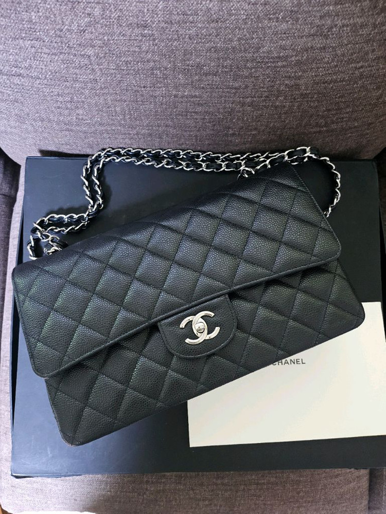 샤넬 클래식 라지 캐비어 블랙 은장이에요 블랙 캐비어에 은장은 가장 인기있는 백이죠 신형 내장칩 버전이에요 외부 상태는 정말 최상이고 내부는 사용감 존재해요 지금 샤넬 클래식라지 매장가 1930만원이에요 저렴한 가격에 언른 겟하세요 본품 더스트 북렛 박스구성 중고거래 특성상 가품외에는 환불 불가해요 직거래시 펑방지금 10만원 있어요
